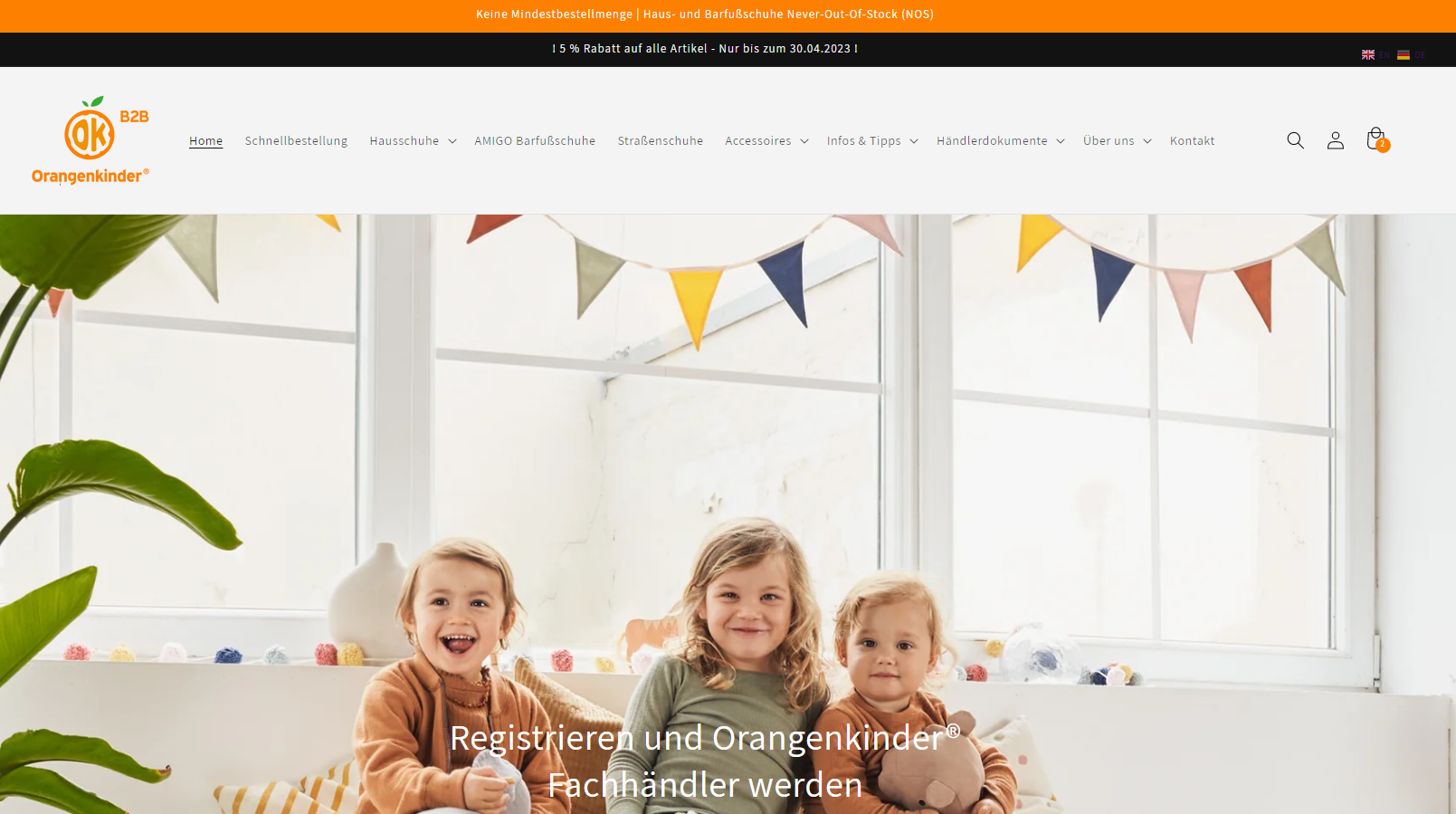 hier habt Ihr die Möglichkeit Euch als Fachhändler in unserem Orangenkinder® B2B Shop zu registrieren oder einzuloggen. Nachdem Ihr Euch registriert habt, bekommt Ihr von uns eine Bestätigungs E-Mail. Dann könnt Ihr gleich loslegen! Im B2B- Shop findet Ihr neben der aktuellen Kollektion alle für Euch relevanten Informationen, z.B. den aktuellen Katalog, Preislisten, sowie EAN-Listen, Mood- und Produktfotos und könnt diese dort unkompliziert abrufen.
