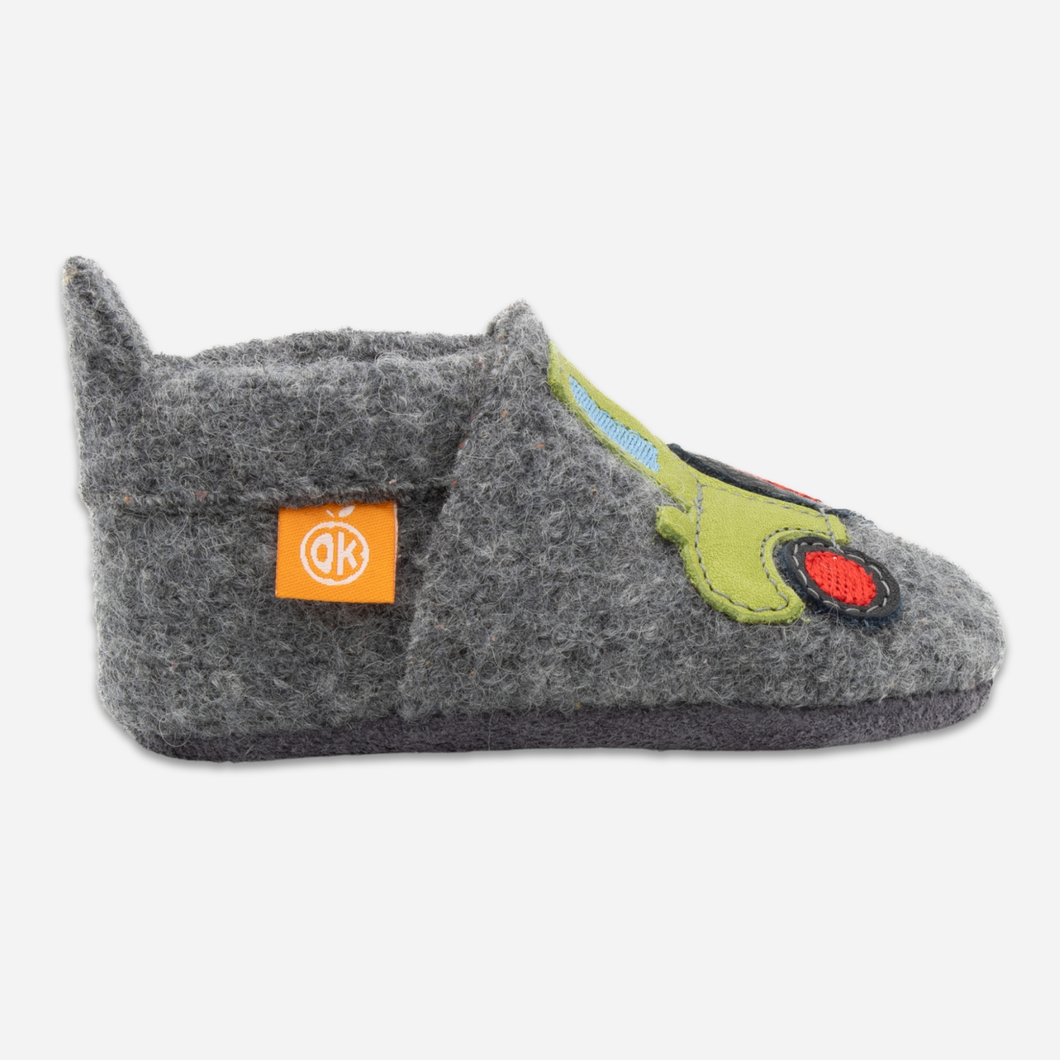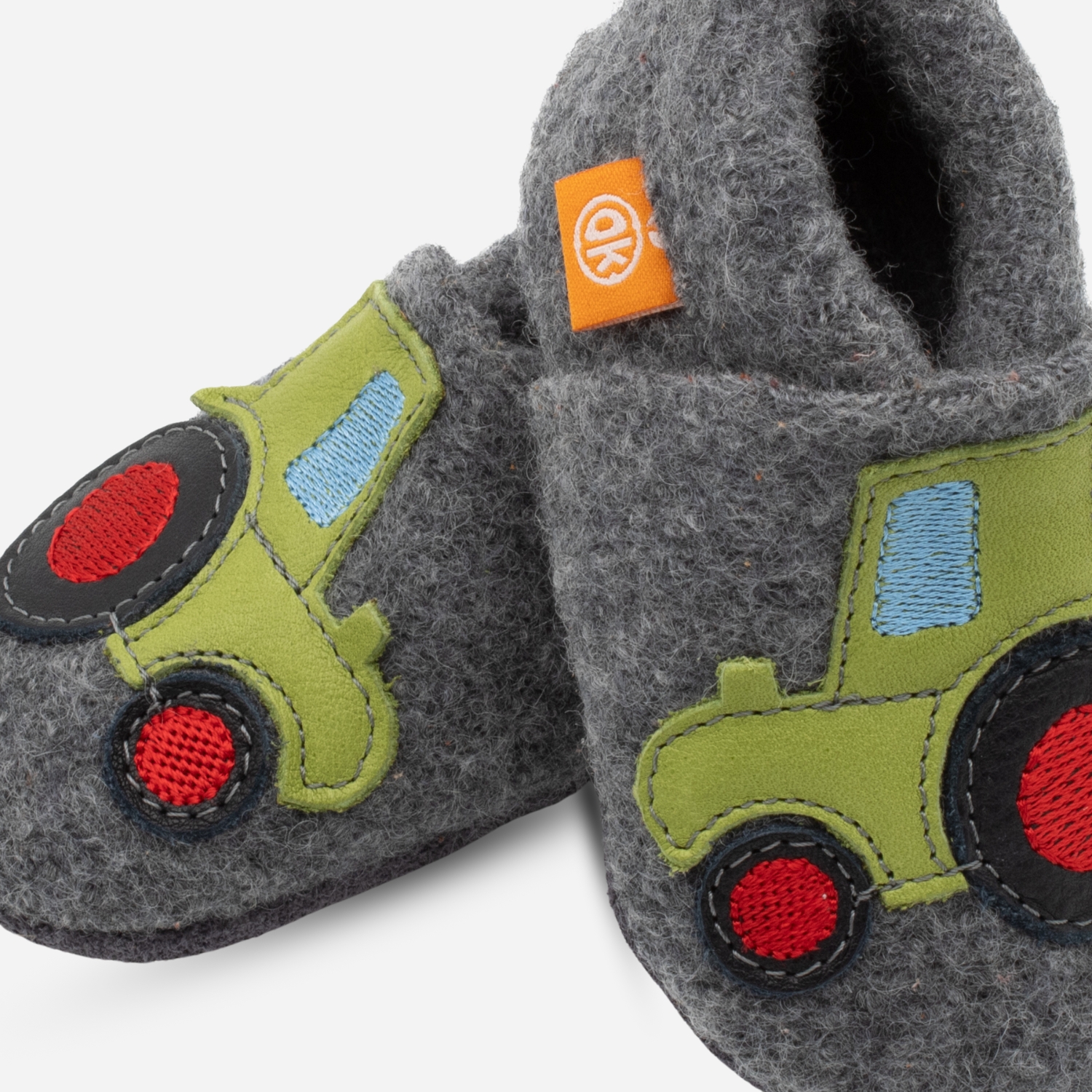 Children’s slippers made of 100% merino wool from Orangenkinder®: Orangenkinder love being out and about in nature. Here in Franconia, agriculture is widespread and our Herbert the tractor is out in the fresh air all day long. Reinforcement in the nursery with strong tractor motif Herbert!