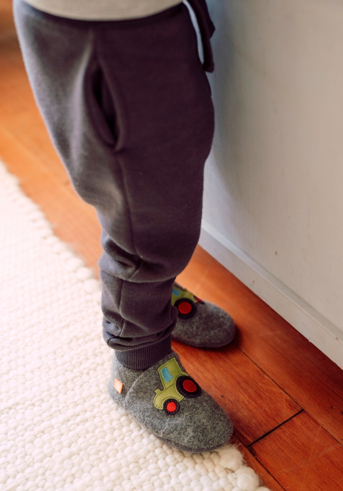 Our cuddly warm Orangenkinder® “Herbert the tractor” wool slippers for children are made from genuine Tyrolean wool, while the sole is made from breathable, vegetable-tanned organic leather. Ideal for cold winter days.