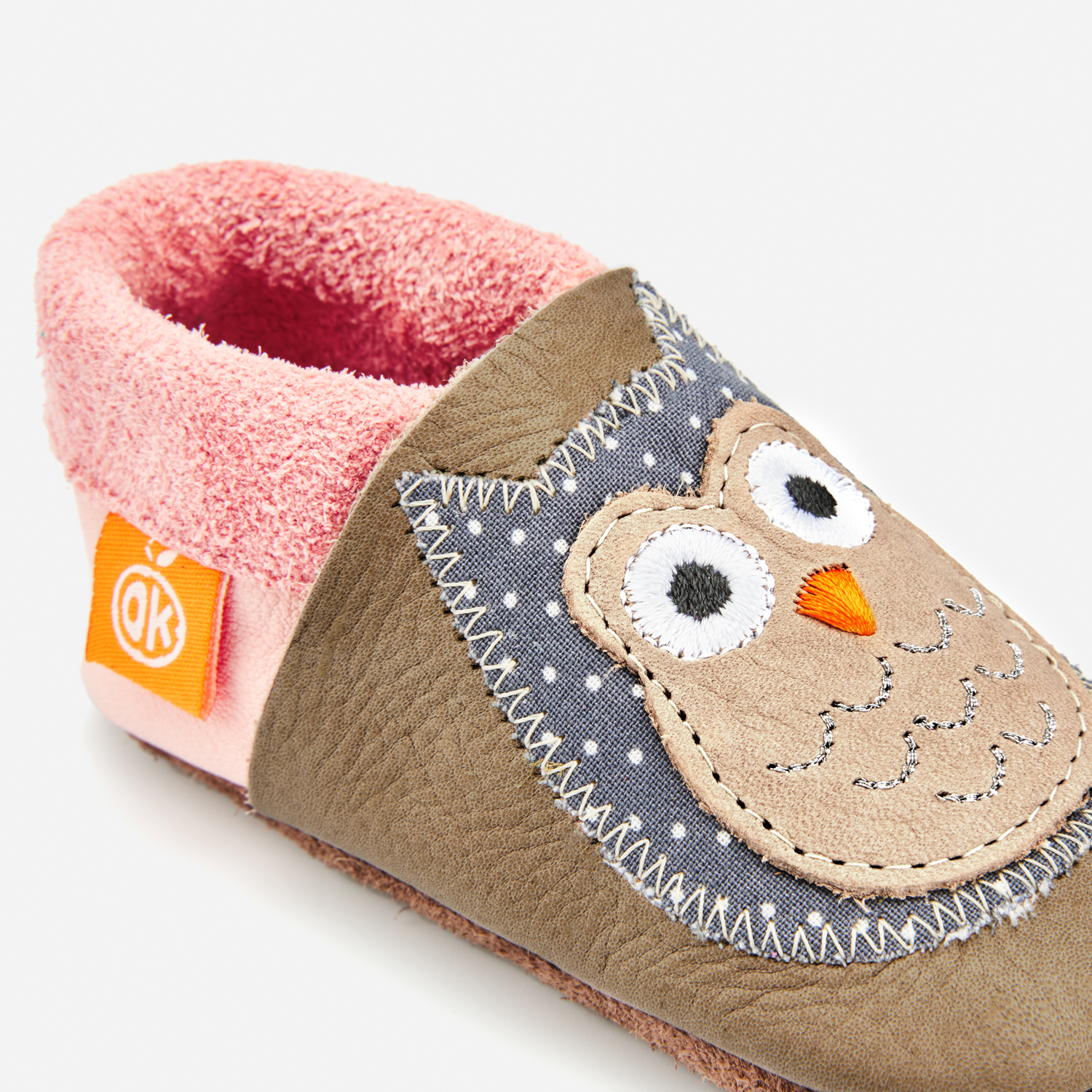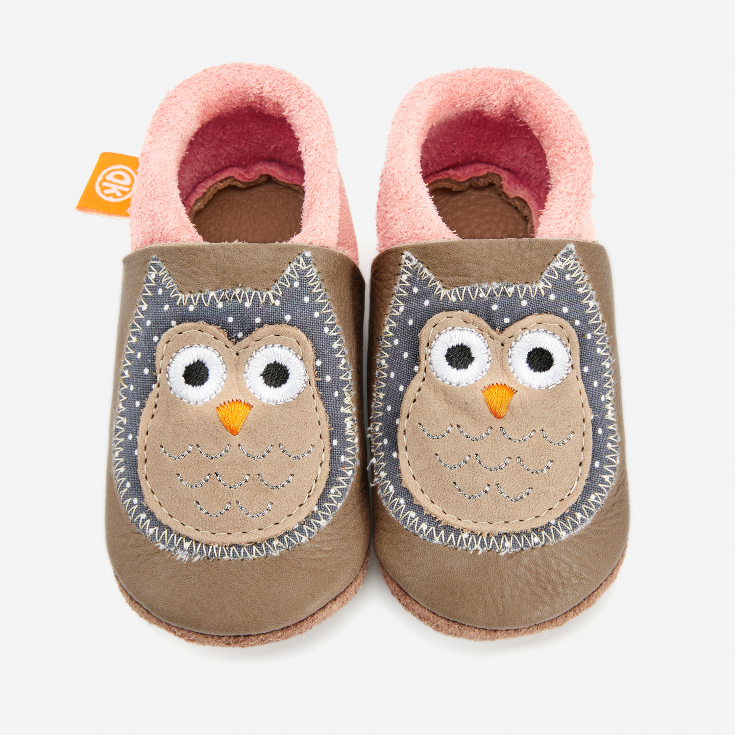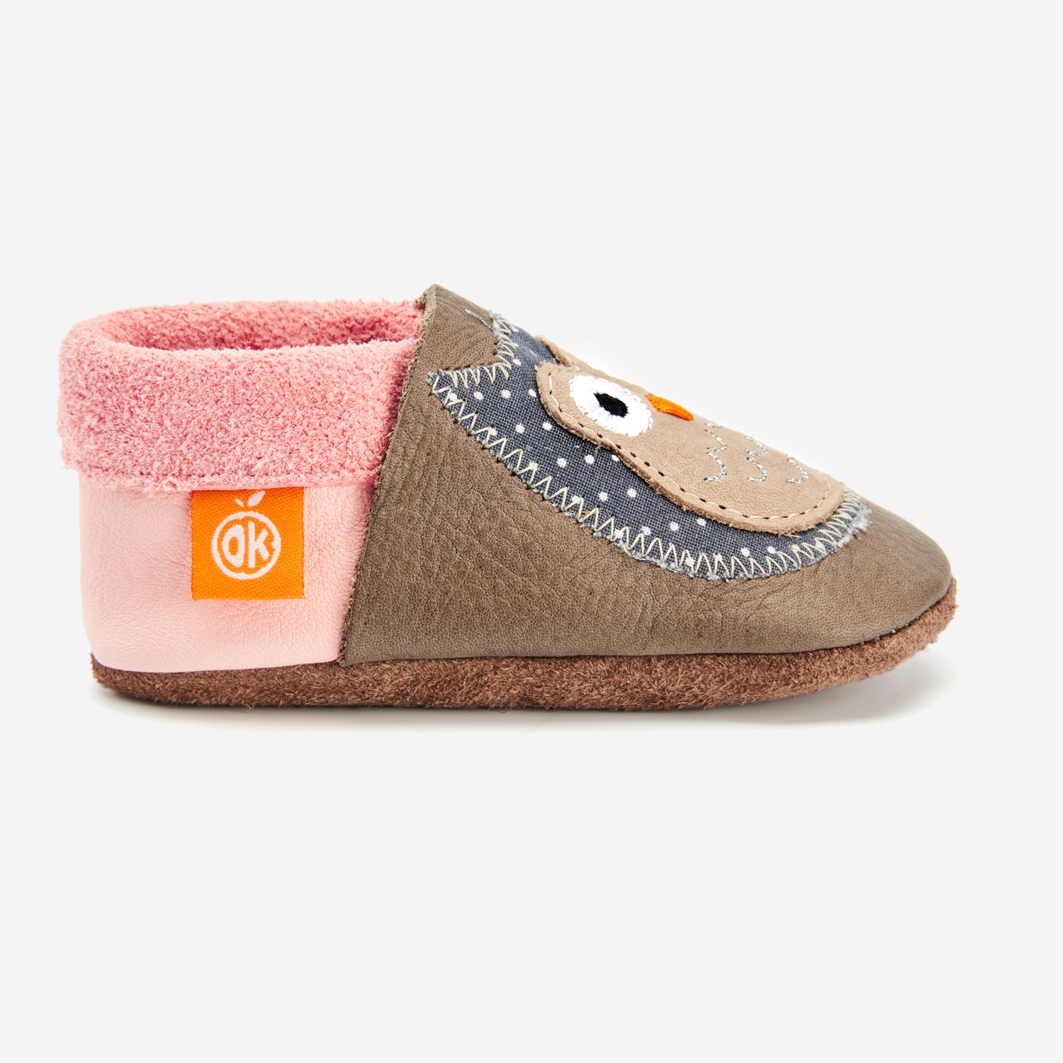 Children’s slippers and crawling shoes from Orangenkinder®: Here comes our cheerful Eulalia the Owl with her pink-beige robe and silver plumage. With her particularly sharp eyes, she is the watchful companion for your next adventure!