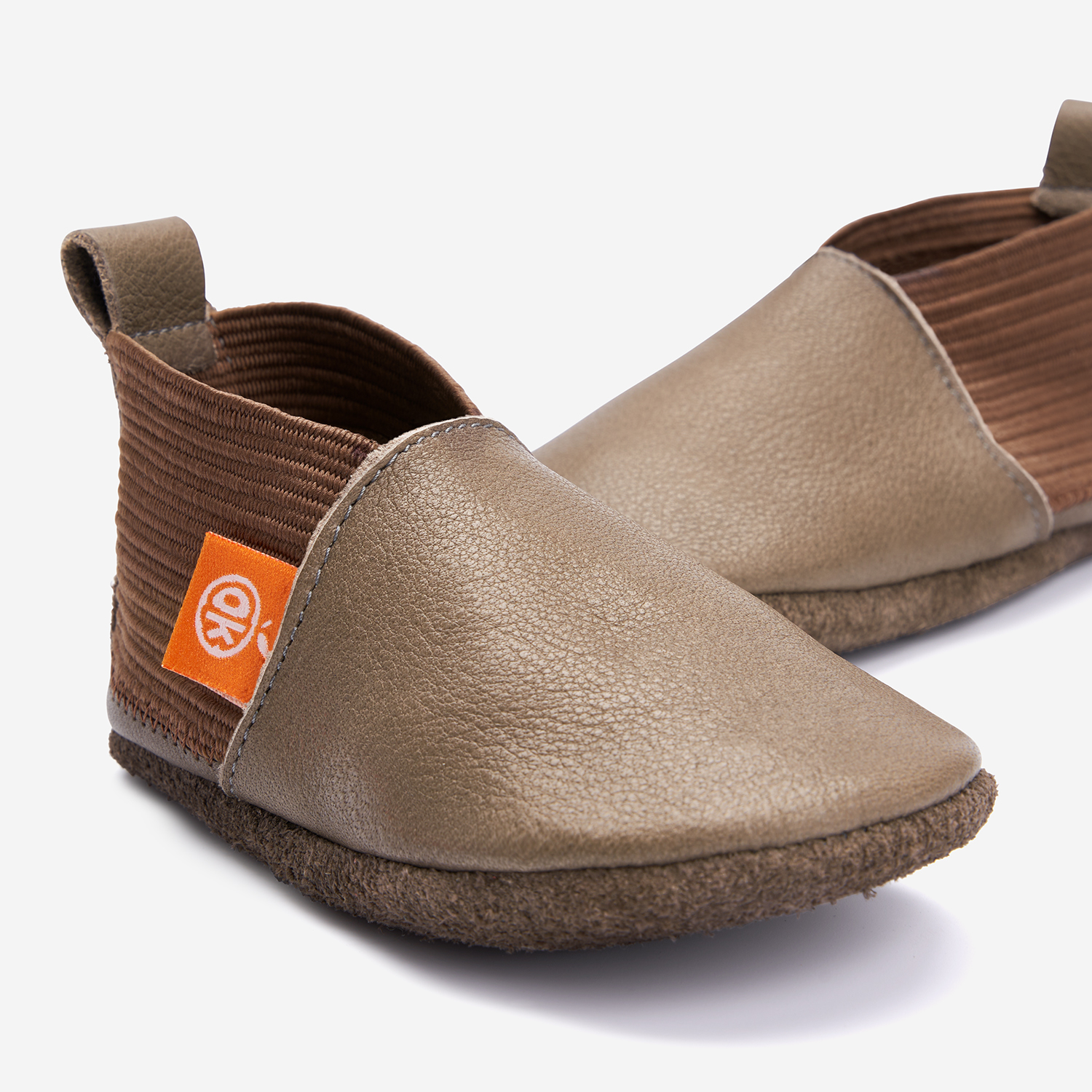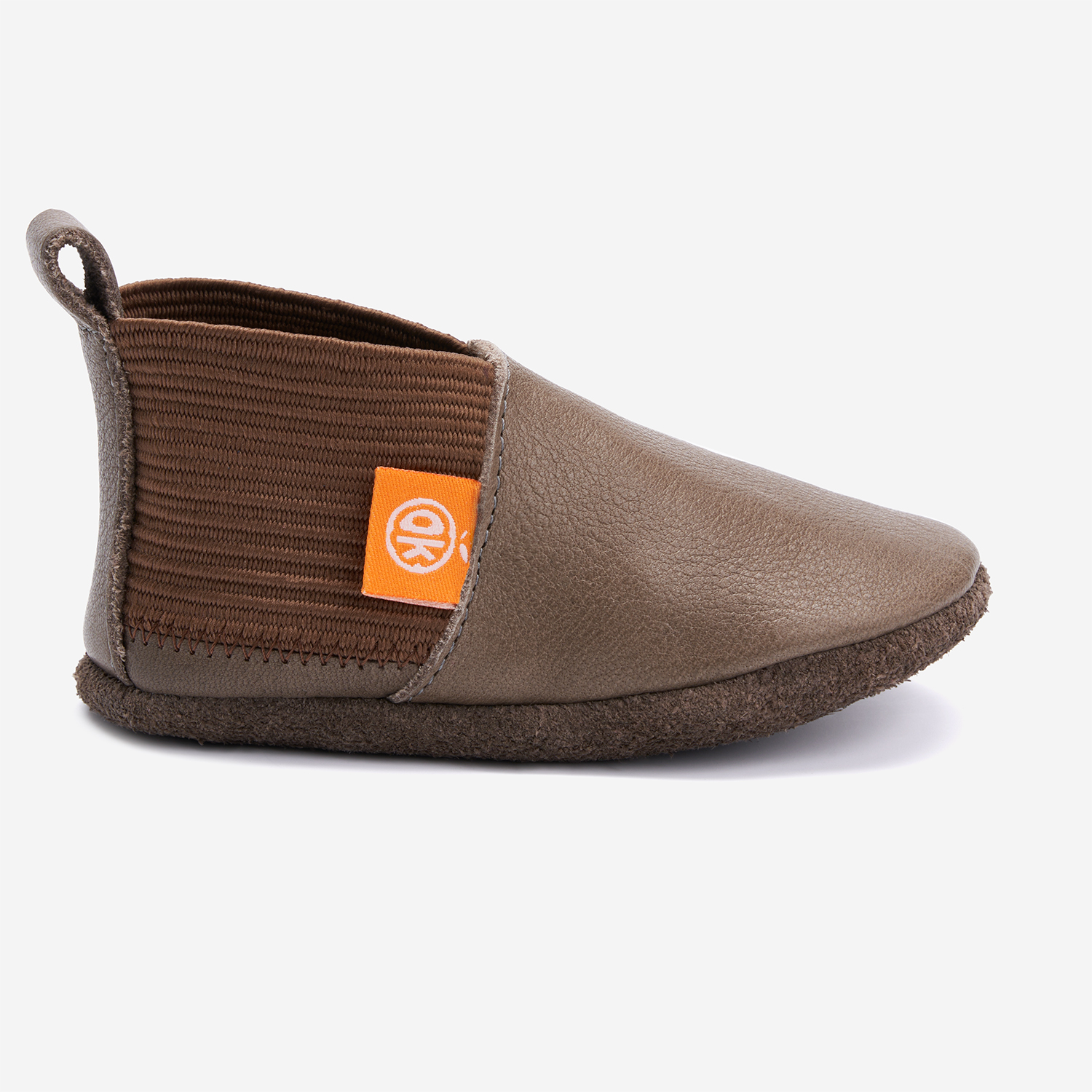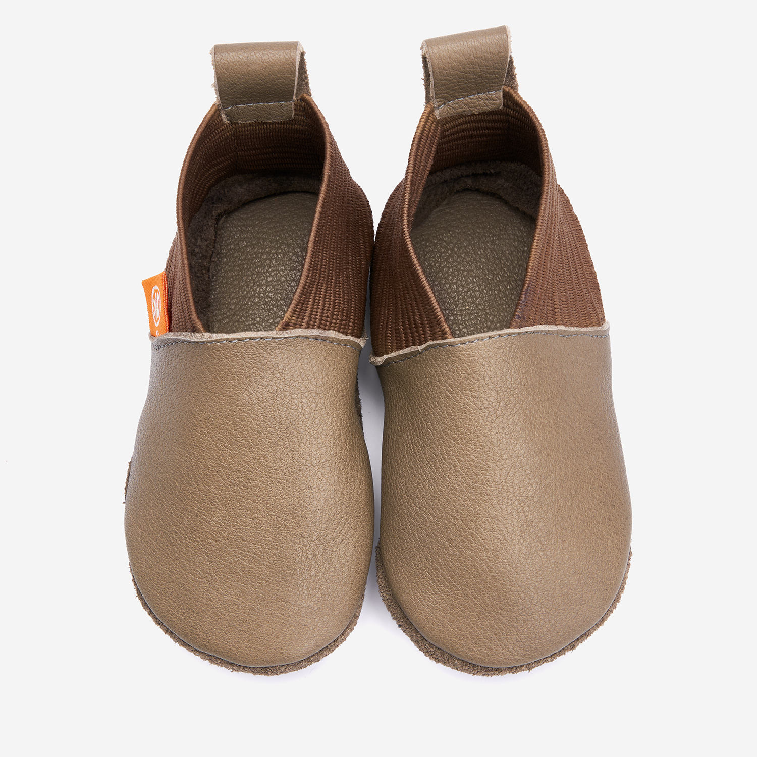 Our Orangenkinder® “Elasties” house and crawling shoes in beige are entirely handmade from breathable, vegetable-tanned organic leather. Perfect as first-walker shoes, crawling shoes, or simply to protect little children’s feet – they offer enough room to grow without constricting the feet. This creates a wearing sensation almost identical to healthy barefoot walking.