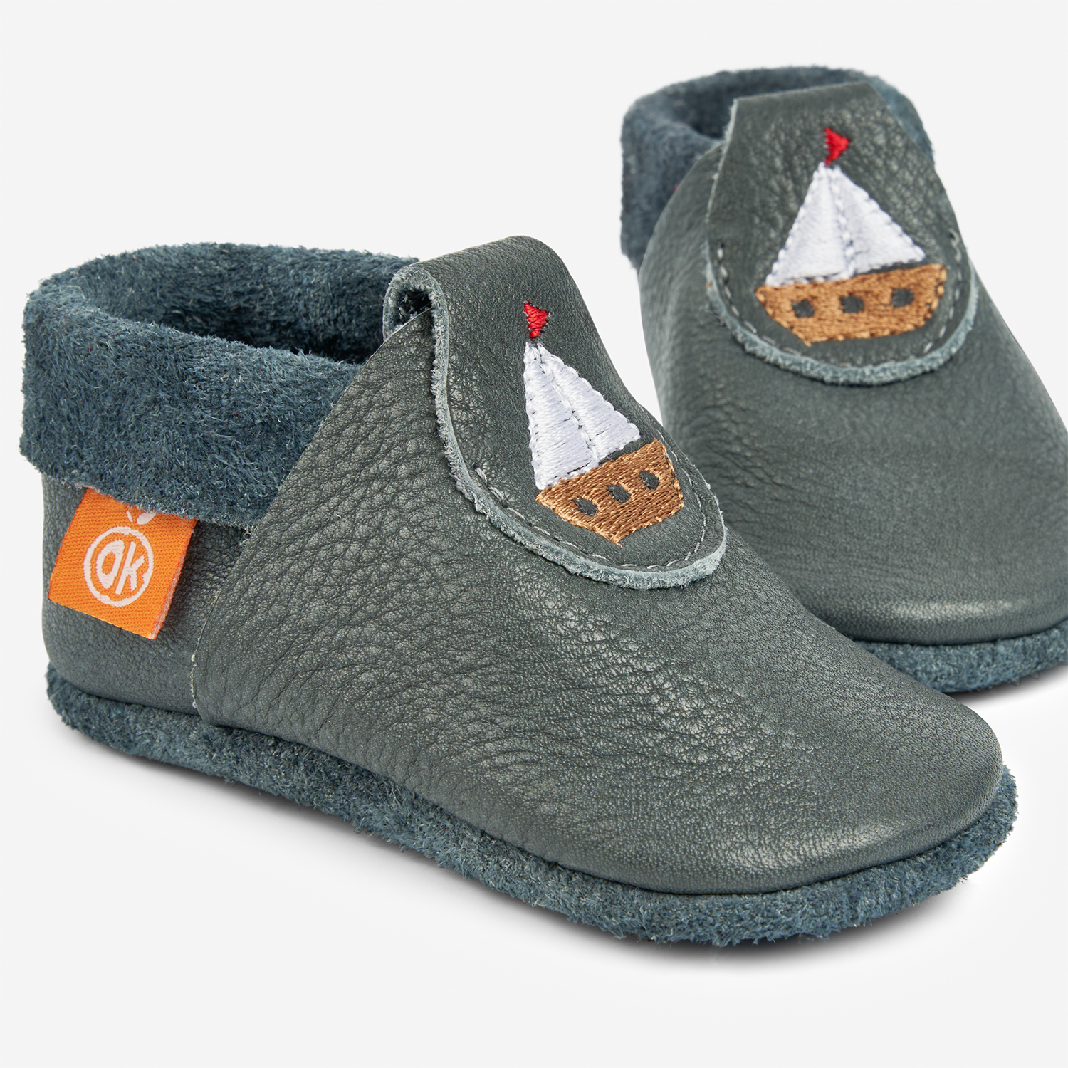 Kids’ slippers and crawling shoes from Orangenkinder®: Ahoy! Full speed ahead! 🚢 The Orangenkinder® Poppies impress with their simple design and the loving embroidered motifs on the tongue.
