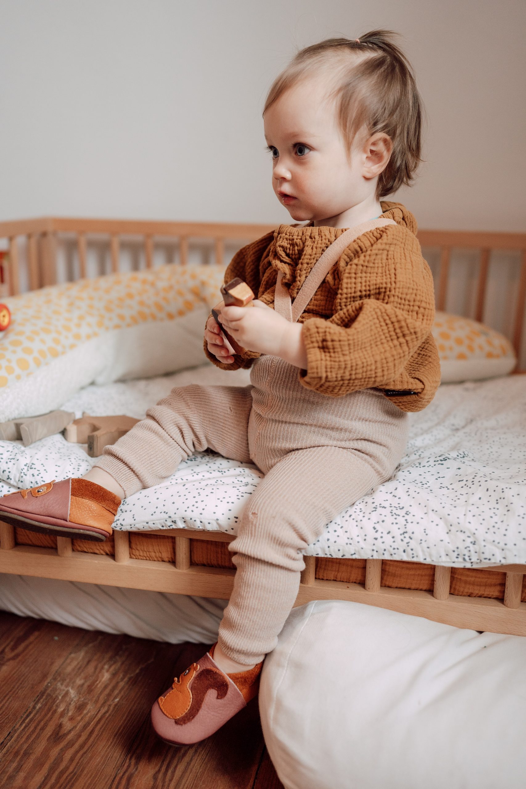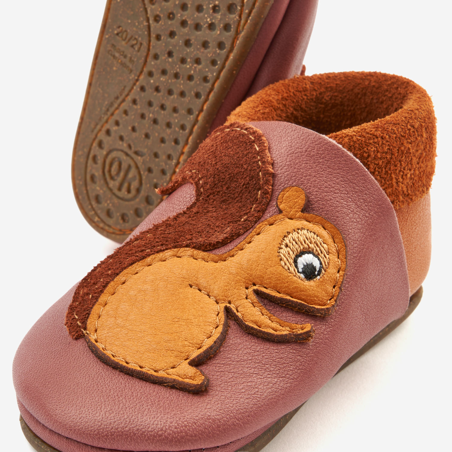 Unsere Orangenkinder® Kinder-Barfußschuhe „AMIGO Knusper das Eichhörnchen“ werden aus atmungsaktivem, pflanzlich gegerbtem Bio-Nappaleder in Handarbeit gefertigt. Die rutschfeste, flexible Sohle aus Gummi und recyceltem Kork macht sie zu idealen Begleitern für kleine Abenteuer im Innenbereich und bei trockenem Wetter auch draußen.