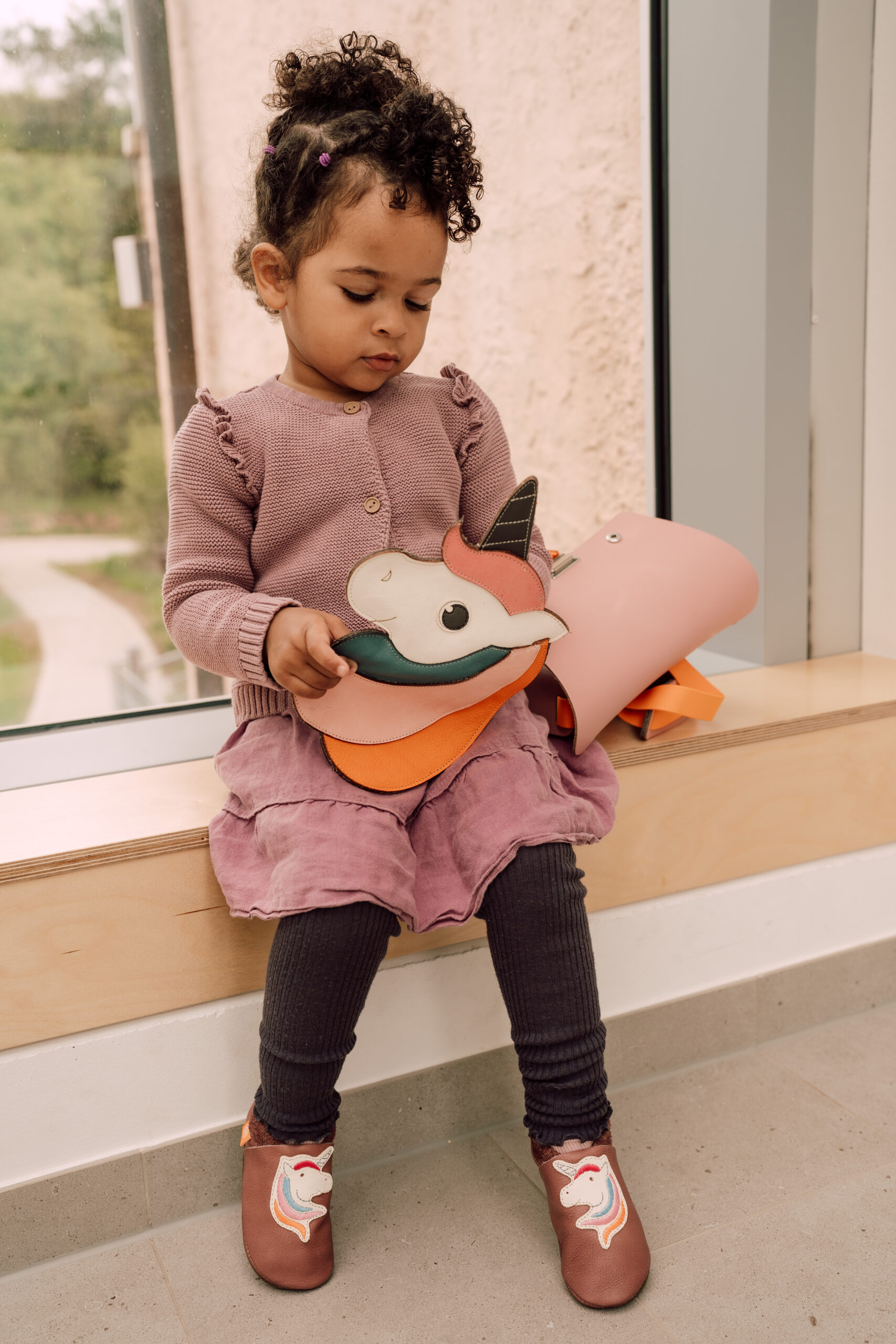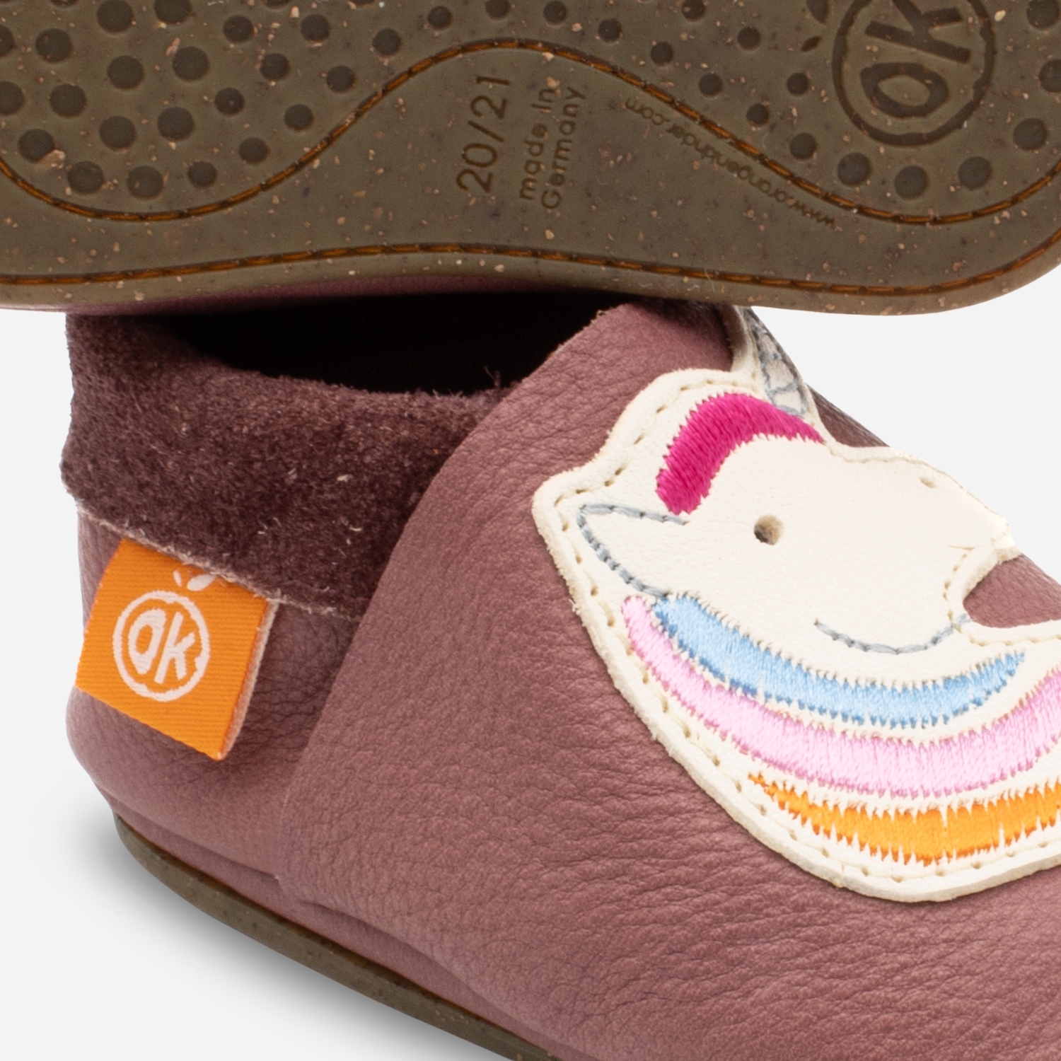 Unsere Orangenkinder® Kinder-Barfußschuhe „AMIGO Stella das Einhorn“ werden aus atmungsaktivem, pflanzlich gegerbtem Bio-Nappaleder in Handarbeit gefertigt. Die rutschfeste, flexible Sohle aus Gummi und recyceltem Kork macht sie zu idealen Begleitern für kleine Abenteuer im Innenbereich und bei trockenem Wetter auch draußen.