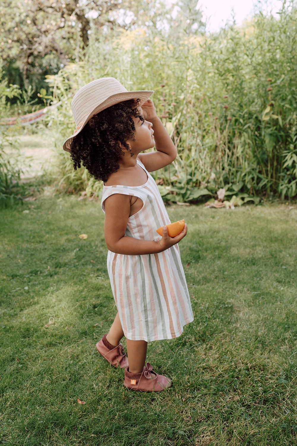 Dank des von Hand eingenähten Gummibands kann die Kinder-Barfußsandale bei den ganz Kleinen nicht abrutschen, während größere Kinder mühelos hinein- und herausschlüpfen. Das spart Zeit und macht den Alltag für Eltern leichter.
