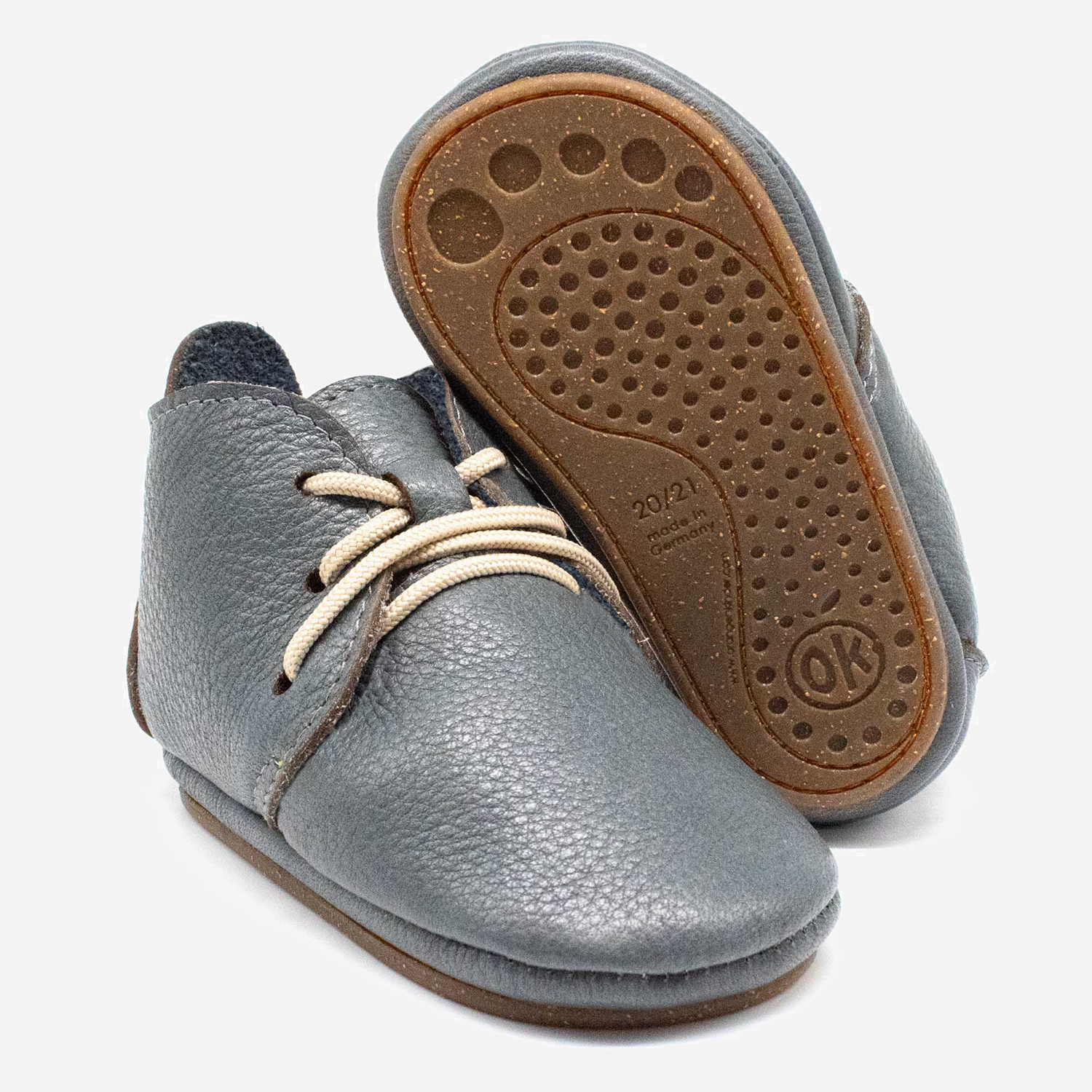 Unsere Orangenkinder® Barfußschuhe „AMIGO Schnürer“ in blaugrau sind aus atmungsaktivem und pflanzlich gegerbtem Bio-Nappaleder händisch gefertigt. Durch die rutschfeste, flexible Sohle aus Gummi und recyceltem Kork ist er perfekt geeignet für Eure kleinen Abenteuer im Innen- und trockenen Außenbereich.