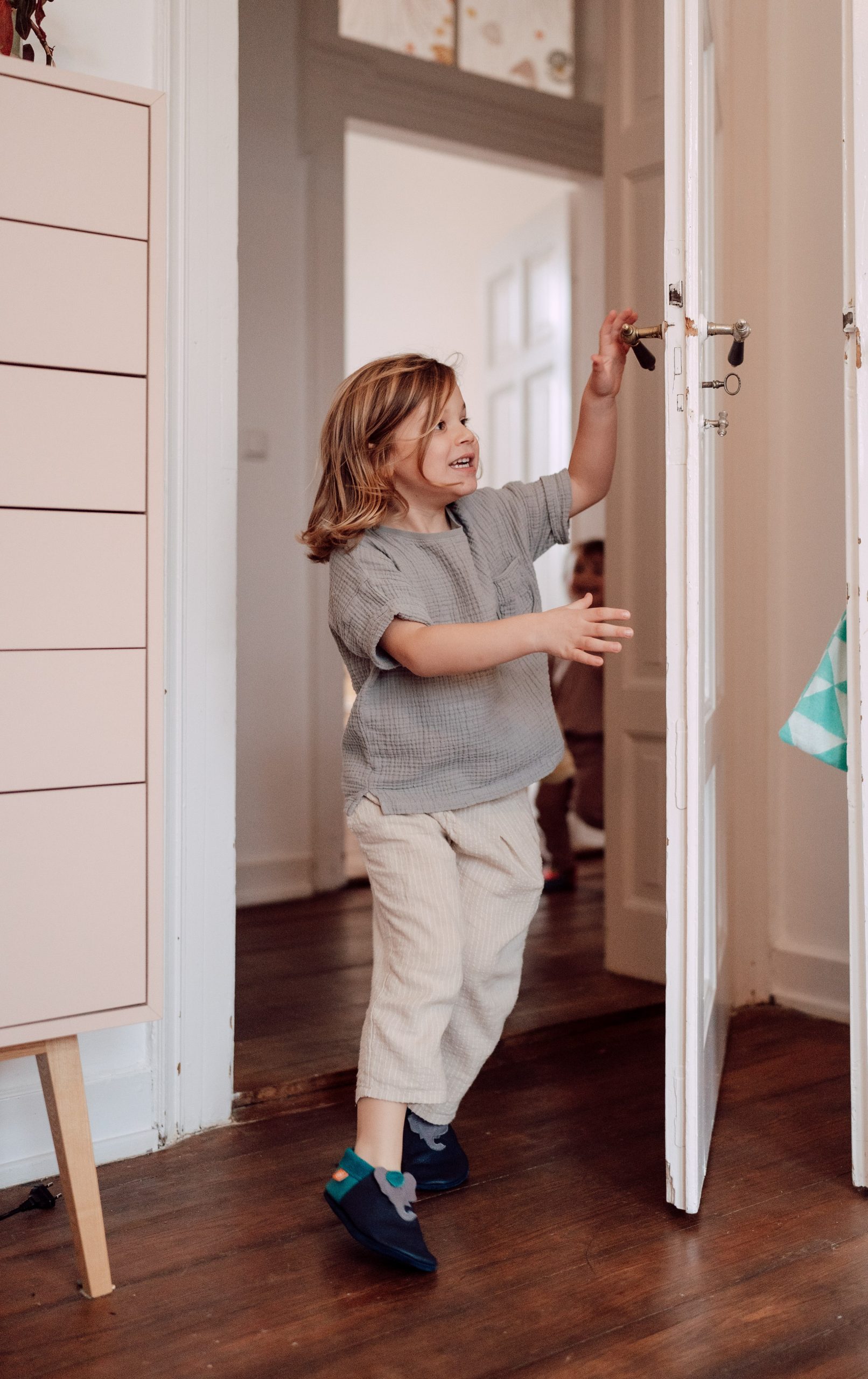 Besonders praktisch: Dank des handeingenähten Gummibands bleiben die Schuhe bei Babys sicher am Fuß, während größere Kinder blitzschnell hinein- und rausschlüpfen können.