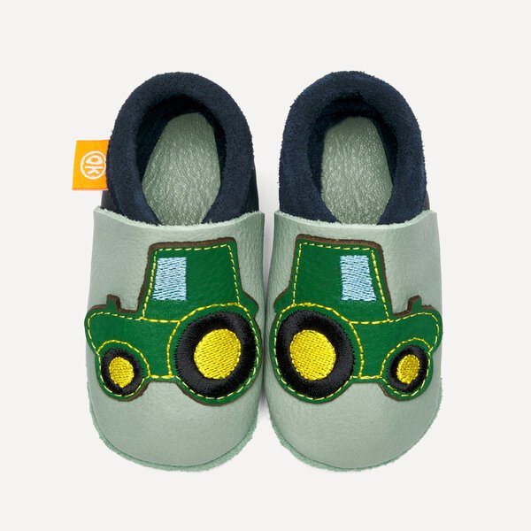 Kinder-Hausschuhe und Krabbelschuhe von Orangenkinder®: Orangenkinder sind gerne in der Natur unterwegs. Hier bei uns im Frankenland ist die Landwirtschaft stark verbreitet und unser Herbert der Traktor ist den ganzen Tag an der frischen Luft. Verstärkung im Kinderzimmer mit starkem Traktor-Motiv Herbert!