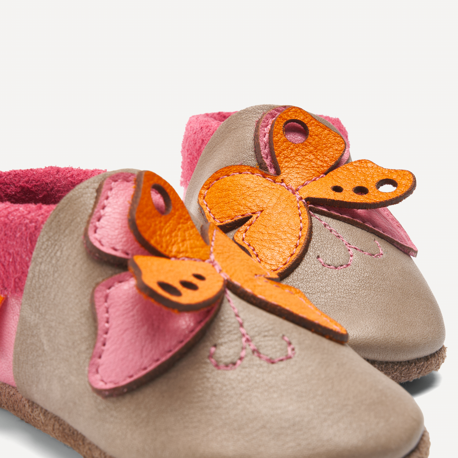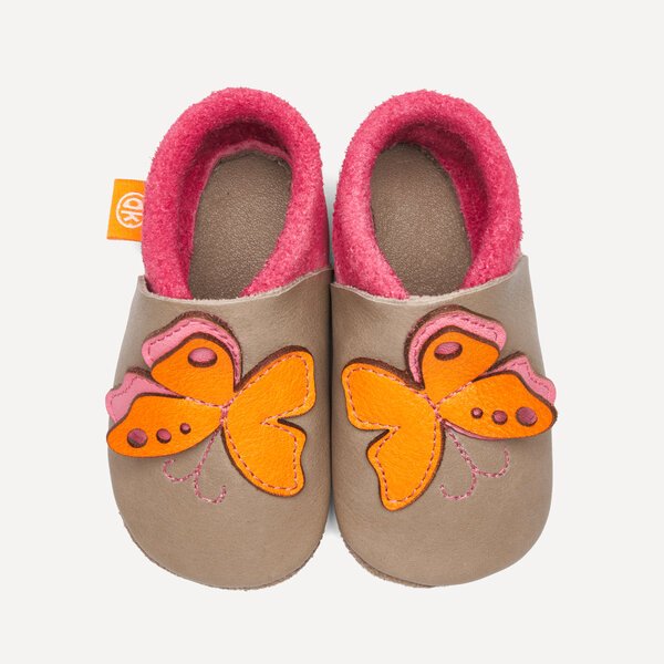 Unsere Orangenkinder® Leder-Hausschuhe „Schmetterling 3D“ werden liebevoll aus atmungsaktivem, pflanzlich gegerbtem Bio-Leder von Hand gefertigt. Ob als erste Krabbelschuhe, als Laufenlernschuhe oder einfach zum Schutz kleiner Zehen – sie lassen den Füßen genug Platz zum Wachsen und fühlen sich fast so frei an wie barfuß.
