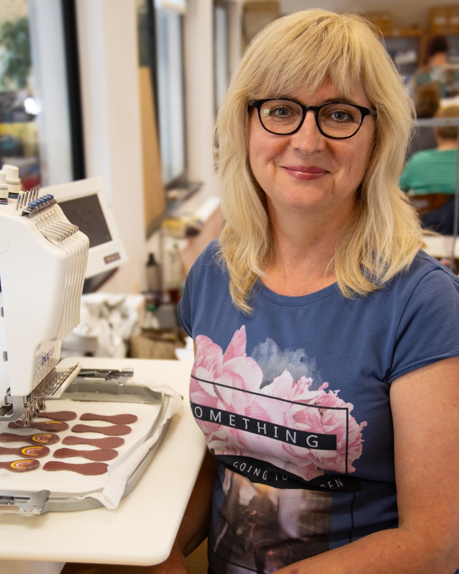 Das ist Julia, sie ist zuständig für die ganzen tollen Stickereien auf unseren Krabbelschuhen. Das, und viele andere organisatorische Arbeiten in der Produktion, macht sie schon seit über fünfzehn Jahren bei uns. 🇩🇪